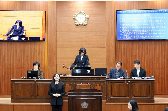 한편, 안건 처리에 앞서 정유나 의원은 5분 자유발언을 통해 사당4동 꿈돌이 어린이 공원 공영주차장 복합화 사업 관련 여러 문제점을 지적하며 구민들과의 소통을 통해 해결책을 점검할 것을 당부했다.
