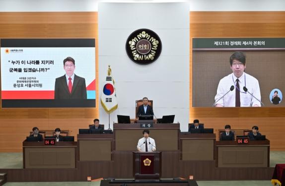 문성호 서울시의원(국민의힘, 서대문2)은 20일 서울특별시의회 제321회 정례회 5분 발언을 통해 초급간부의 주거환경, 급여 수준, 수당 실태 등 모두 군인 개인의 희생만을 강요하는 실태를 꼬집으며 대한민국 안보 근간이 흔들리는 상황을 변화시키기 위한 처우 현실화를 촉구했다.