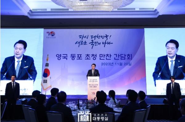 대통령은 또한 “지난 6월 출범한 재외동포청이 모국과 동포사회를 긴밀히 연결하면서, 동포들을 지원하는 든든한 울타리가 될 것”이라고 약속했다. 대통령은 이어 “영국에서 운영 중인 23개의 한글학교가 동포 자녀들의 한글 교육과 역사 문화 교육에 힘쓰고 있음을 평가하고, 재외동포청도 영국에서 성장하는 차세대 동포들이 대한민국에 대한 긍지와 자부심을 지켜갈 수 있도록 지원할 것”이라고 말했다.