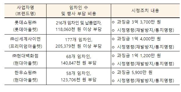 [중앙뉴스라인, 우제헌기자] 공정거래위원회는 대형 아울렛 4개사가 판매촉진 행사 실시 전에 서면 약정하지 않고 매장임차인)에게 행사 비용을 부담시킨 행위에 대해 시정명령 및 과징금(6억 4,800만 원) 부과를 결정했다.