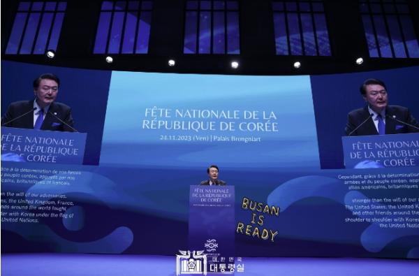 [중앙뉴스라인, 우제헌기자] 윤석열 대통령 부부는 2030 부산세계박람회 유치 성공을 위한 프랑스 파리 방문 둘째 날 마지막 공식 일정으로 오늘(현지시간 11. 24, 금) 저녁 프랑스 파리의 브롱냐르궁(宮)에서 개최된 국경일 리셉션에 참석했다.