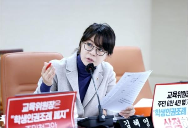 마지막으로 김혜영 의원은 ”디벗 스마트 기기, 전자칠판, 디지털교과서 보급 등 교육청이 소위 디지털교육에 박차를 가하는 상황에서 정작 일선 학교 현장에서는 무선 인터넷 장애가 빈번하게 발생하고 있는 것은 심각한 문제다. 학내에 무선 인터넷망이 안정적으로 구축되지 않는다면 교육청이 보급한 태블릿pc나 전자칠판은 아무 쓸모가 없는 무용지물에 불과할 수밖에 없다“고 꼬집으면서, ”교육청은 태블릿pc, 전자칠판 물량 보급에만 매몰되지 말고 디지털 교육 실시를 위한 제반 환경 구축에 좀 더 신경써야 할 것“고 주문하며 질의를 마쳤다.