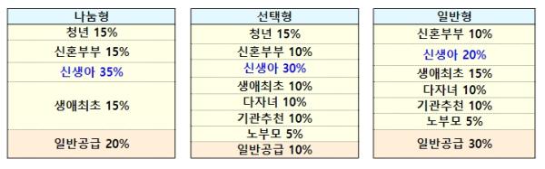 (맞벌이 기준 완화) 뉴:홈 특별공급에 맞벌이 가구는 1인 소득기준(일반공급, 월평균소득 100%)의 2배인 월평균소득 200%까지 청약가능한 추첨제(각 유형별 10%)를 신설한다.