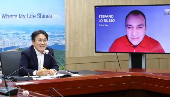 강기정 광주광역시장은 30일 오후 시청에서 이탈리아 토리노시 스테파노 로 루쏘 시장과 화상회의를 진행, 두 도시 간 협력방안을 논의했다.