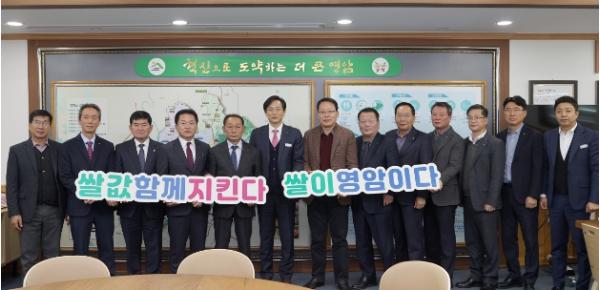 4일 우승희 영암군수와 강찬원 영암군의회의장, 지역농협 조합장 등이, 군청에서 ‘쌀 수급 현안 관계자 회의’를 열고, 최근 가파른 하락세를 보이는 수확기 쌀값에 대응하는 방안을 논의하고 대책을 발표한 것.