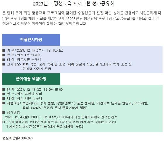 [중앙뉴스라인, 김병연기자] 광주학생교육문화회관이 오는 14~16일 올해 한 해 동안 진행한 평생학습 프로그램의 성과물을 전시·체험할 수 있는 ‘2023년도 평생교육 프로그램 성과공유회’를 개최한다.