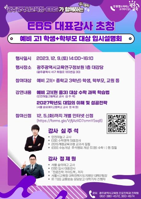[중앙뉴스라인, 김병연기자] 광주시교육청이 오는 9일 14시 광주광역시교육연구정보원 대강당에서 ‘EBS 대표강사 초청 중3(예비 고1) 학생 및 학부모 대상 입시설명회’를 개최한다.