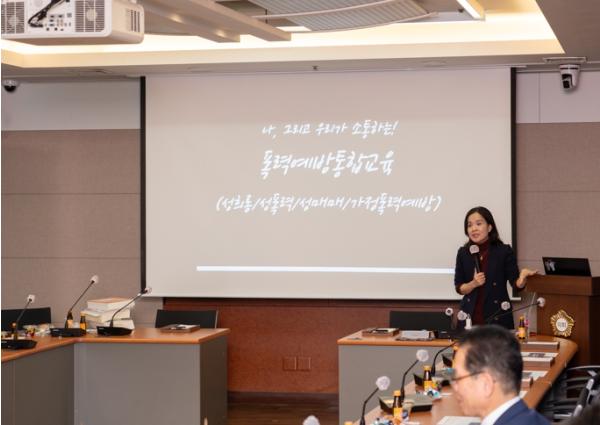 폭력예방 통합교육을 맡은 한국양성평등교육진흥원 김선하 강사는 4대 폭력에 대한 통념을 점검하고 성인지 감수성을 높일 수 있는 실천방안 등에 관한 내용으로 교육을 진행했다.