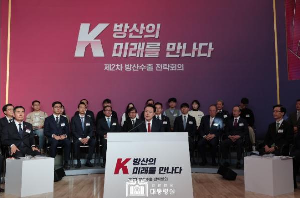 [중앙뉴스라인, 우제헌기자] 윤석열 대통령은 12월 7일 오전 경기 성남시 판교에 소재한 방산업체 한화에어로스페이스에서 ?제2차 방산수출전략회의?를 주재했다. 오늘 회의는 작년 경남 사천 한국항공우주산업에서 개최된 ?2022년 방산수출전략회의?에 이어 대통령이 주재한 두 번째 민·관·군 합동회의이다. 회의 종료 후 대통령은 LIG넥스원으로 장소를 옮겨 청년 방위산업 종사자들과 간담회를 했다.