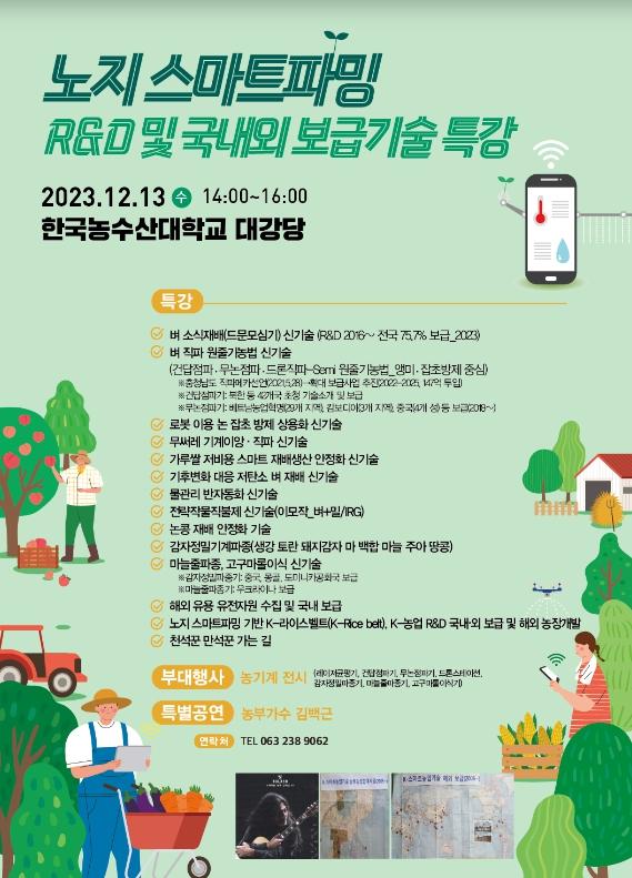 이날은 박광호 교수(한농대 식량작물전공)가 벼 등 노지 식량작물 재배방식을 스마트파밍(smart farming) 기술을 활용하여 생산성을 높인 성과를 발표하며, 최근 꾸준히 발전하고 있는 노지 스마트파밍 기술개발 현황과 국내외 보급 사례도 소개한다.