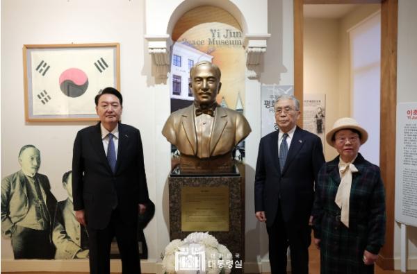대통령은 대한민국 대통령으로서 이준 열사 기념관에 처음으로 방문한 것을 뜻 깊게 생각한다며 어려운 상황에서도 국권 회복과 독립을 위해 애쓰신 순국선열들의 희생 덕분에 오늘날의 자유 대한민국이 존재하는 것이라고 강조했다. 또한 대통령은 자유, 정의, 평화를 위해 헌신하신 열사의 정신을 가슴 깊이 새기고 이준 열사의 애국정신과 평화를 향한 숭고한 뜻을 알리는 노력을 정부도 계속 지원해 나가겠다고 밝혔다.