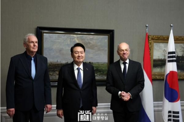 [중앙뉴스라인, 우제헌기자] 네덜란드를 국빈 방문 중인 윤석열 대통령은 오늘(현지시간 12. 13, 수) 오전 헤이그 상원 건물에서 얀 안토니 브라윈(Jan Anthonie Bruijin) 상원의장 및 레이몬드 드 로온(Raymond de Roon) 하원 부의장을 합동 면담했다.