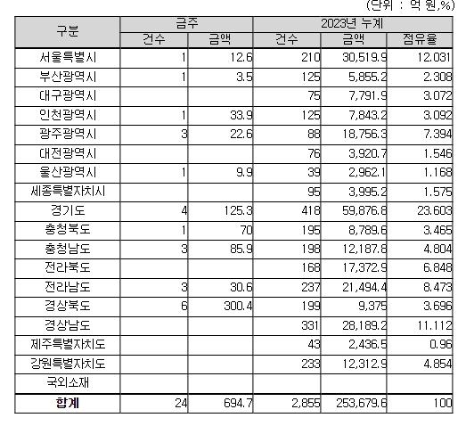 지역별로는 경상북도 300억 원, 경기도 125억 원, 충청남도 86억 원, 그 밖의 지역이 184억 원이다.