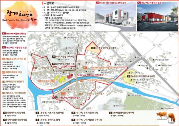 주요 사업으로 ?RedFood 특화거점 조성, ?상권 활성화 기반 조성, ?RedFood의 고장 장계 만들기 3개 단위 사업이 추진된다. 아울러 장계리에 한우와 사과 등 특산물을 활용한 소비 및 창업지원, 주민 커뮤니티 공간을 만들고, 100년 역사의 전통시장인 장계시장을 정비해 상권 활성화를 도모한다.