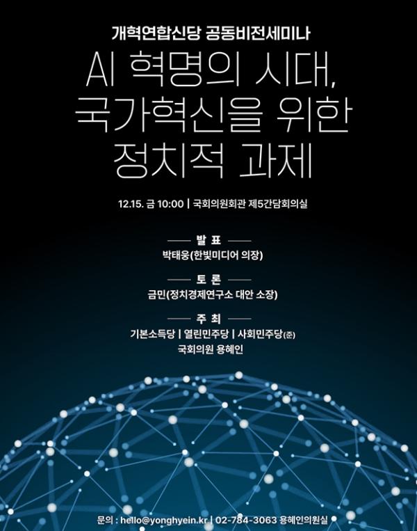 [중앙뉴스라인, 우제헌기자] 15일 오전 10시, 개혁연합신당 첫 공동비전세미나가 국회의원회관 제5간담회의실에서 개최됐다. 'AI 혁명의 시대, 국가혁신을 위한 정치적 과제' 세미나는 개혁연합신당을 추진하고 있는 기본소득당, 열린민주당, 사회민주당(준), 국회의원 용혜인이 주최했다. 각 당 대표의 인사말에 이어, 박태웅 한빛 미디어 의장이 발표자로 나서 “AI 혁명의 시대, 국가혁신을 위한 정치적 과제”라는 주제로 공동비전세미나의 포문을 열었다.