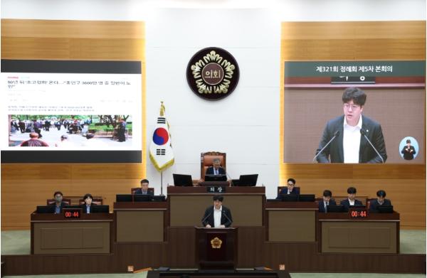김 의원은 지난 한 달 동안 문제가 된 5가지 사례(▲ 돌 투척으로 70대 노인 사망 사고, ▲ 배달라이더 신분증 확인 이유로 폭행당한 사고, ▲ 똑닥 어플리케이션 유료화 문제로 인한 유아층, 노년층 소외, ▲ 치킨 던져 길 가던 행인 피해, ▲ 저출산, 고령화 심화로 인한 심각한 인구 문제)를 통해 시민이 체감할 수 있을 만한 정책은 부족한 실정을 지적하고 시민 안전 및 보호 대책 마련이 시급함을 호소했다.
