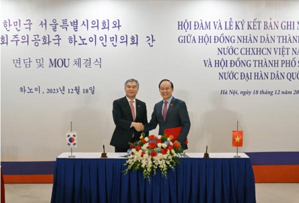 [중앙뉴스라인, 이승훈기자] 김현기 서울특별시의회 의장은 18일 응웬 응옥 뚜언 하노이인민의회 의장과 만나 우호협력 강화를 위한 양해각서를 체결했다.