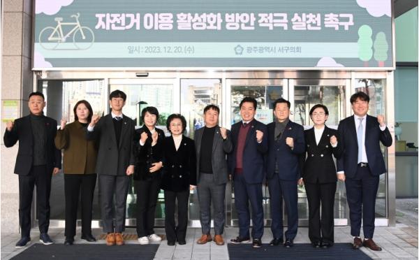 서구의원 일동은 행정안전부 및 국토교통부 등 관계 부처, 광주 경찰청과 과 서부경찰서, 그리고 광주광역시청과 서구청에 ▲ 자전거 이용 안전 증진을 위한 자전거 횡단도 등 관련 시설 확충 및 관리 강화 ▲자전거 교통 관련 시설물의 디자인에 대한 통일감 있는 모델화 구축 ▲자전거 이용 활성화 계획 수립 및 조례 개정 등을 촉구했다.