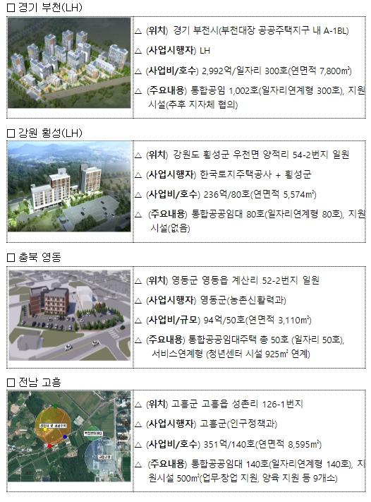 국토교통부는 지난 9월부터 약 2개월간 일자리연계형 지원주택 사업 공모(9.15.~11.30.)를 실시하고, 현장조사?제안발표 및 전문가 종합평가 등을 통해 지자체가 제안한 2곳(영동, 고흥)과 한국토지주택공사(이하 LH)가 제안한 2곳(부천, 횡성)을 사업 대상지로 선정했다.