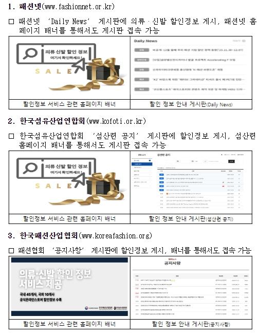 이용필 첨단산업정책관은 “의류·신발 할인 정보 안내 서비스를 통해 그간 소비자들이 각 기업의 온라인 판매 사이트를 통해 확인해야 했던 할인 정보를 패션넷 등을 통해 한 번에 파악할 수 있도록 개선했다.”라며, “소비자들은 좋은 품질의 제품을 합리적인 가격에 구매하고, 국내 패션기업들은 내수시장을 토대로 성장해나갈 수 있는 Win-win 정책을 앞으로도 지속 발굴하고 추진해 나가겠다.”고 언급했다.
