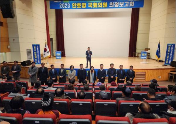 [중앙뉴스라인, 우제헌기자] 더불어민주당 안호영 의원(전북 완주·진안·무주·장수군)이 지난 21일 완주 문화예술회관에서 의정보고회를 개최했다. 이날 열린 의정보고회에는 유희태 완주군수와 권요안·윤수봉 도의원, 서남용 완주군의회 의장을 비롯한 군의원, 지역위원회 주요 당직자와 당원 등 완주군민 1,000여 명이 찾아 성황을 이뤘다.