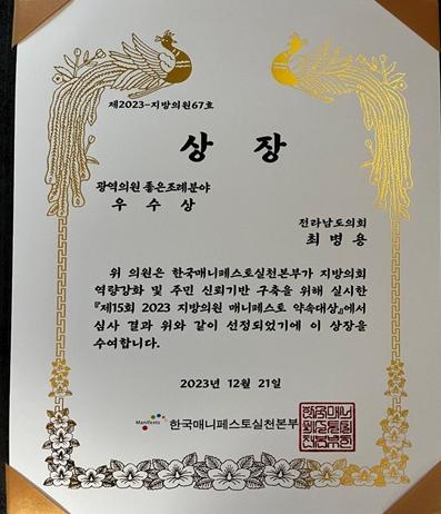 최병용 전남도의원, 2023 매니페스토 지방의원 약속대상 수상
