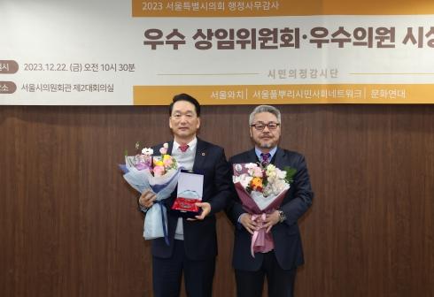 ‘2023년 서울특별시의회 행정사무감사 우수 상임위원회, 우수의원’ 시상식은 ‘서울Watch, 서울풀뿌리시민사회네트워크, 문화연대’ 등이 공동주최 및 주관한 행사로서, 서울시의회의 행정사무감사 활동을 감시하기 위해 공개 모집 후 구성된 ‘시민의정감시단’을 통해 10개 상임위원회와 소속 의원(상임위원장 제외)을 대상으로 영상회의록 및 속기록 등을 꼼꼼히 모니터링하여 의정활동을 면밀히 분석하는 등 공정한 평가를 토대로 우수 상임위원회와 우수의원을 선정했다.