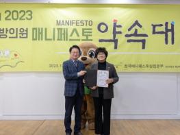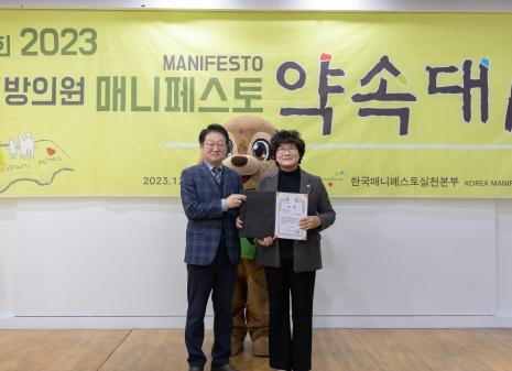 ‘지방의원 매니페스토 약속대상’은 전국 지방의회의원을 대상으로 참다운 지방자치 실현 및 지방의원의 공약이행, 입법활동의 우수사례를 발굴하기 위해 공약이행, 좋은 조례 등 2개 분야의 우수한 의원에게 시상하는 상이다.