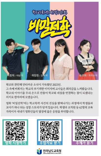 [중앙뉴스라인, 차행운기자] 전라남도교육청이 학교폭력예방을 주제로 만든 영화 '비밀전학'이 지난 14일과 18일 호평 속에 시사회를 마치고 누구나 볼 수 있도록 수업자료와 함께 공개된다.