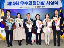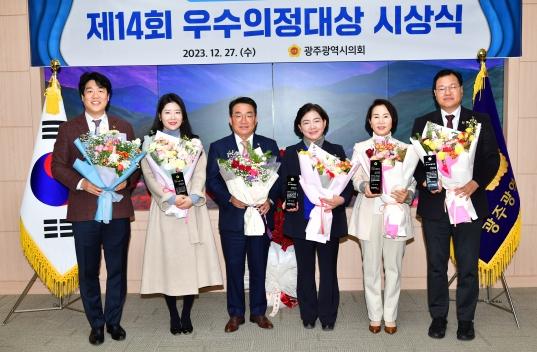 [중앙뉴스라인, 정향훈기자] 광주광역시의회는 27일 시의회 열린시민홀에서 ‘제14회 우수의정대상’ 수상 의원(김용임, 박미정, 박희율, 안평환, 채은지) 시상식을 개최했다.