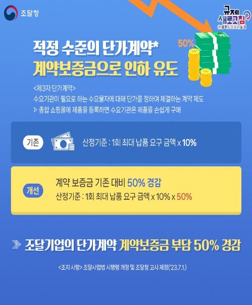 조달청은'조달사업법 시행령'개정 등을 통해 지난 7월부터 다수공급자계약 및 우수조달물품 계약 등 ‘제3자 단가계약’ 체결 시 납부하는 계약보증금을 기존의 50% 수준으로 완화하여 시행하고 있다.