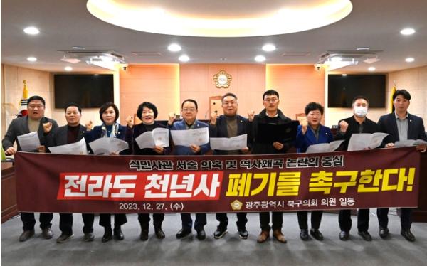 북구의회 의원 일동은 성명서를 통해 “시민사회단체를 비롯한 역사단체, 정치권을 중심으로 강한 반발이 일어나고 있음에도 불구하고 광주,전남,전북 3개 시도와 편찬위원회 측은 여전히 책자 발간을 주장하고 있다” 며 “'전라도 천년사'의 자체적 폐기와 사업 시행 주체인 지자체는 공식 입장 및 향후 계획을 발표해야한다” 고 밝혔다.
