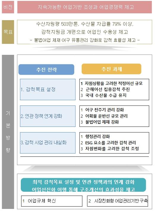 이 기본계획은 ?연근해어업의 구조개선 및 지원에 관한 법률? 제6조에 따라 5년마다 수립하는 법정계획으로, 향후 5년간 연근해 어선 감척 목표와 함께 수산자원 회복과 연근해어업 경쟁력 강화를 위한 세부전략을 담고 있다.