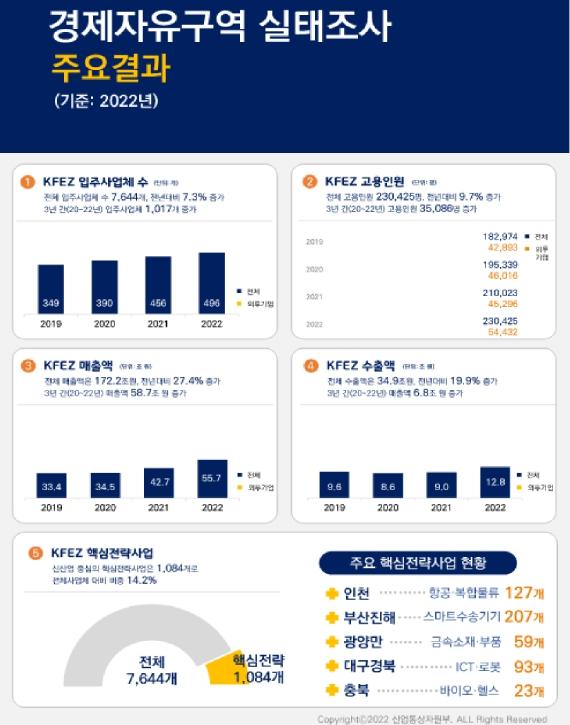 [중앙뉴스라인, 우제헌기자] 산업통상자원부는 2022년말 기준으로 경제자유구역 입주사업체 실태를 조사한 결과, 입주사업체 수는 7,644개로 전년 대비 7.3%(520개) 증가, 외투기업은 496개로 8.8%(40개) 증가, 전체 고용인원은 230,425명으로 9.7%(20,402명) 증가, 전체 입주사업체의 매출액은 172.2조원으로 27.4%(37.1조원) 증가하여 견고한 성장세를 이어갔다고 '2022년 경제자유구역 입주 사업체 실태조사' 결과를 발표했다.