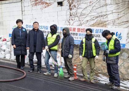 현장 점검을 마치며 이상수 의원은 “경사가 심한 해당 구간에 도로열선을 설치할 수 있게 되어 다행이다”며 “도로열선 공사를 조속히 마무리 지어 쾌적하고 안전한 도로환경 조성을 부탁드린다”고 말했다. 최미경 의원은 “열선 설치 후에도 도로 미끄럼 방지 등 제설대책을 보강하고, 도로포장 등 도로와 열선의 유지관리에도 소홀함이 없도록 신경을 써달라”고 당부했다.