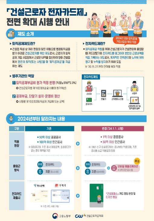 [중앙뉴스라인, 우제헌기자] 고용노동부와 건설근로자공제회(이사장 김상인)는 ‘24.1.1.부터 건설근로자 퇴직공제 가입 대상이 되는 모든 건설공사(공공 1억원, 민간 50억원 이상)*에 전자카드제를 적용한다고 밝혔다.