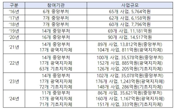 [지자체] 서울시가 강동구, 마포구 등 기초지자체 13개 기관과 함께 33개 사업을 통해 385억원(25.5%)을 지원한다. 그리고 경기도(12개 기관, 41개 사업, 153억원(10.2%)), 경상남도(8개 기관, 30개 사업, 107억원(7.1%)), 부산시(4개 기관, 23개 사업, 106억원(7.0%)), 광주시(4개 기관, 14개 사업, 105억원(7.0%)) 순으로 많은 예산을 투입하여 지원한다.