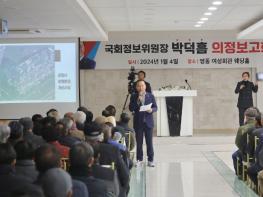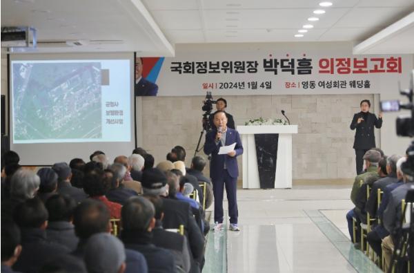 박덕흠 위원장은 이번 영동군 의정보고회를 통해 ▲영동 양수발전소(총사업비 1조 2천억 상당) ▲농촌공간 정비사업(총사업비 294억 상당, 영동읍) ▲영동-진천 고속도로(총사업비 1조 5,500억 상당) ▲영동 세계 국악 엑스포 ▲군청사 보행환경 개선사업 등 영동군의 숙원사업 예산 확보 및 진행 현황을 설명했다. 아울러 더 나은 영동군으로 거듭나기 위해 군민들과 군 발전방안에 대한 의견을 주고받는 시간을 가졌다.
