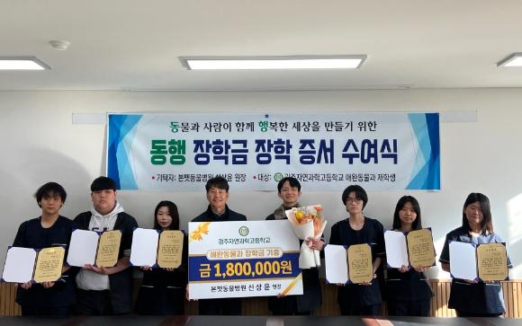 신상윤 원장과 최범태 교장 등 학교 관계자가 참여한 가운데 진행된 이번 행사에서 신원장은 직접 장학생으로 선정된 애완동물과 학생 6명에게 각 30만원씩 총 180만원의 장학금을 전달하고 격려했다.