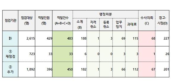 이번 점검으로 공인중개사 429명(16%)의 위반행위 483건을 적발하여, 관련 법령에 따라 68건을 경찰에 수사 의뢰했다. 자격취소 1건, 등록취소 3건, 업무정지 69건, 과태료 부과 115건의 행정처분(188건)을 진행 중이며, 경미한 사항에 대하여는 점검 현장에서 경고 및 시정(227건) 조치했다.