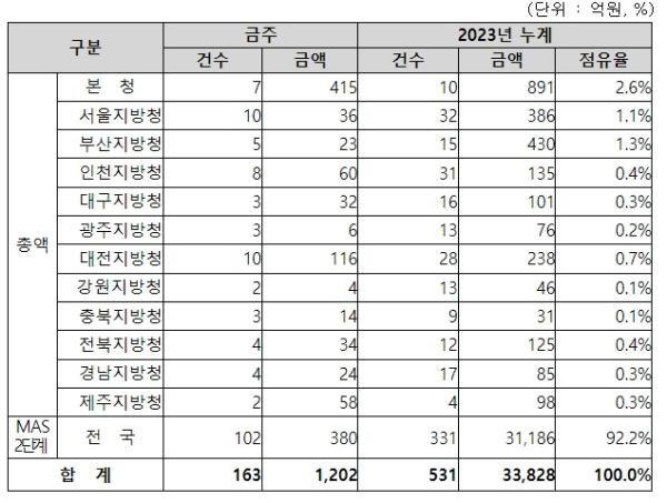 지역별 발주량을 보면, 총액계약 대상 822억 원 중 본청이 415억 원으로 50.5%를 집행하고 서울청 등 11개 지방청에서 407억 원을 각각 집행할 예정이다.