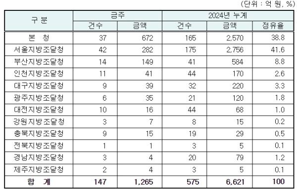 지역별 발주량을 보면 대전광역시 소재 본청 672억 원, 서울지방청 282억 원 등 2개청(954억 원)이 전체 금액(1,265억 원)의 75.4%를 차지하고 있으며, 인천 등 나머지 10개 지방청 311억 원이 각각 집행될 예정이다.