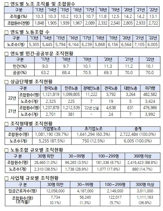 전국노동조합 조직현황은 노동조합법에 따라 설립 신고된 노동조합이 같은 법 제13조에 따라 행정관청에 신고한 2022년 말 기준 현황자료를 한국노동연구원에서 집계·분석한 결과이며, 노동조합이 신고한 조합원 수를 기준으로 조합원 수, 조직률 등 주요 현황을 산정했다.