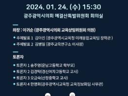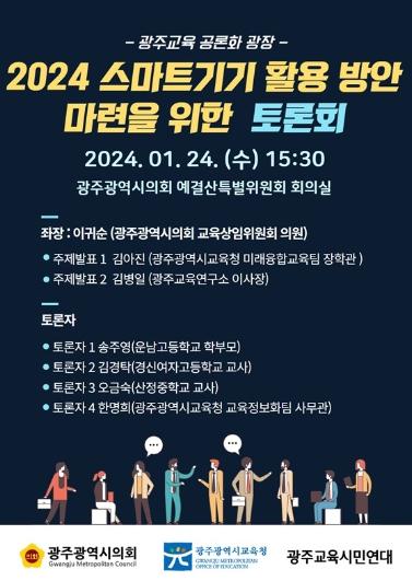 김아진 시교육청 장학관이 ‘AI 광주 미래교육’을 주제로 1차 주제 발표를 한 후, 김병일 광주교육연구소 이사장이 ‘광주시교육청 학교 스마트 기기 보급사업’ 관련 발제를 하게 된다. 이어 이귀순 시의원이 토론회 좌장을 맡고 학부모, 교사, 시교육청 사무관 등이 토론에 나서 ▲광주미래교육의 방향 ▲스마트기기 활용방안 ▲학교 현장의 활용 사례 등에 대한 의견을 나눌 예정이다.