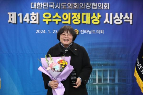 전국시도의회의장협의회가 주관하는 ‘우수의정대상’은 지방자치의회의 효율적 의정활동과 지역주민의 삶의 질 향상, 그리고 중앙과 지방 간 지역 균형발전 및 국가경쟁력 향상에 기여하는 등 우수 의정 활동을 펼친 의원에게 수여되는 상이다.