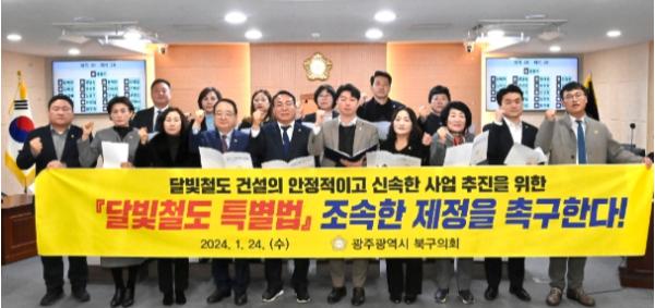 북구의회도 지난 24일 성명서를 발표하고 “달빛철도 건설은 영호남 주민들의 오랜 염원이자 윤석열 대통령 대선 공약으로, 여?야 협치의 상징법안이며 영호남 상생과 균형발전의 대표법안임에도 법제사법위원회 문턱도 못 넘고 있다”고 지적하고 “영호남 상생발전, 지방소멸 위기 극복, 수도권 과밀화 해소, 국토균형발전, 신성장동력 창출, 국가경쟁력 향상 등 대한민국의 미래를 위해 특별법을 조속히 제정할 것”을 촉구한 바 있다.