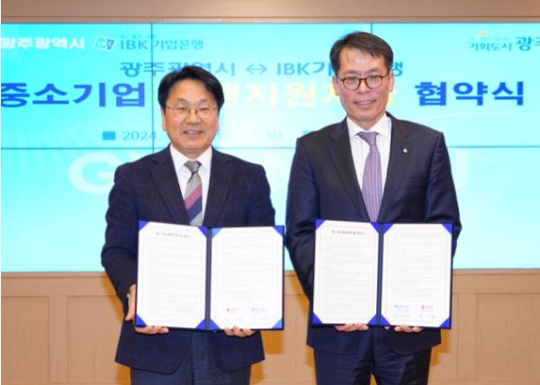광주광역시는 29일 시청 비즈니스룸에서 강기정 시장, IBK기업은행 김성태 행장과 최광진 CIB그룹장, 신준범 호남지역본부장을 비롯해 김승환 신용보증기금 호남영업본부장, 김성태 기술보증기금 호남지역본부장 등이 참석한 가운데 IBK기업은행과 ‘중소기업 동행지원자금 협약’을 체결했다.