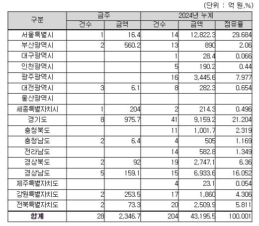 지역별로는 경기도 976억 원, 부산광역시 560억 원, 강원특별자치도 254억 원, 그 밖의 지역이 557억 원이다.