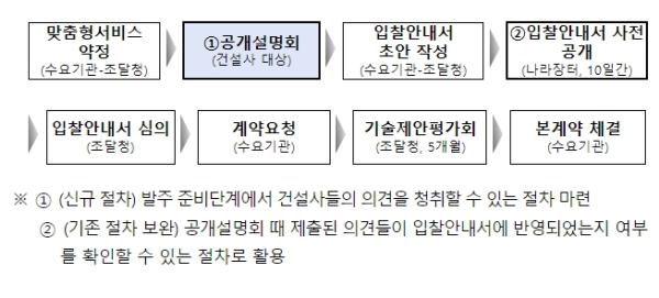 사전설명회 필요성은 지난 1월 23일 대한건설협회와의 간담회에서 주요 대형 기술형입찰 사업의 연이은 유찰 사태에 대한 대책으로 제기됐다. 조달청은 업계 의견을 적극 반영하여 현재 입찰안내서를 준비 중인 ‘정부부산지방합동청사 신축공사’부터 적용하고 2월 중순 동 사업의 사전설명회를 개최할 예정이다.