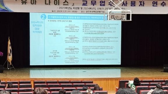 연수는 2023학년도 학년말 교무학사 업무처리, 2024학년도 신학기 교무업무 운영을 위한 기본 설정 정보, 2024학년도 입학 유아 대상 학적처리, 2024학년도 유아별 출결 처리 등으로 구성됐다.